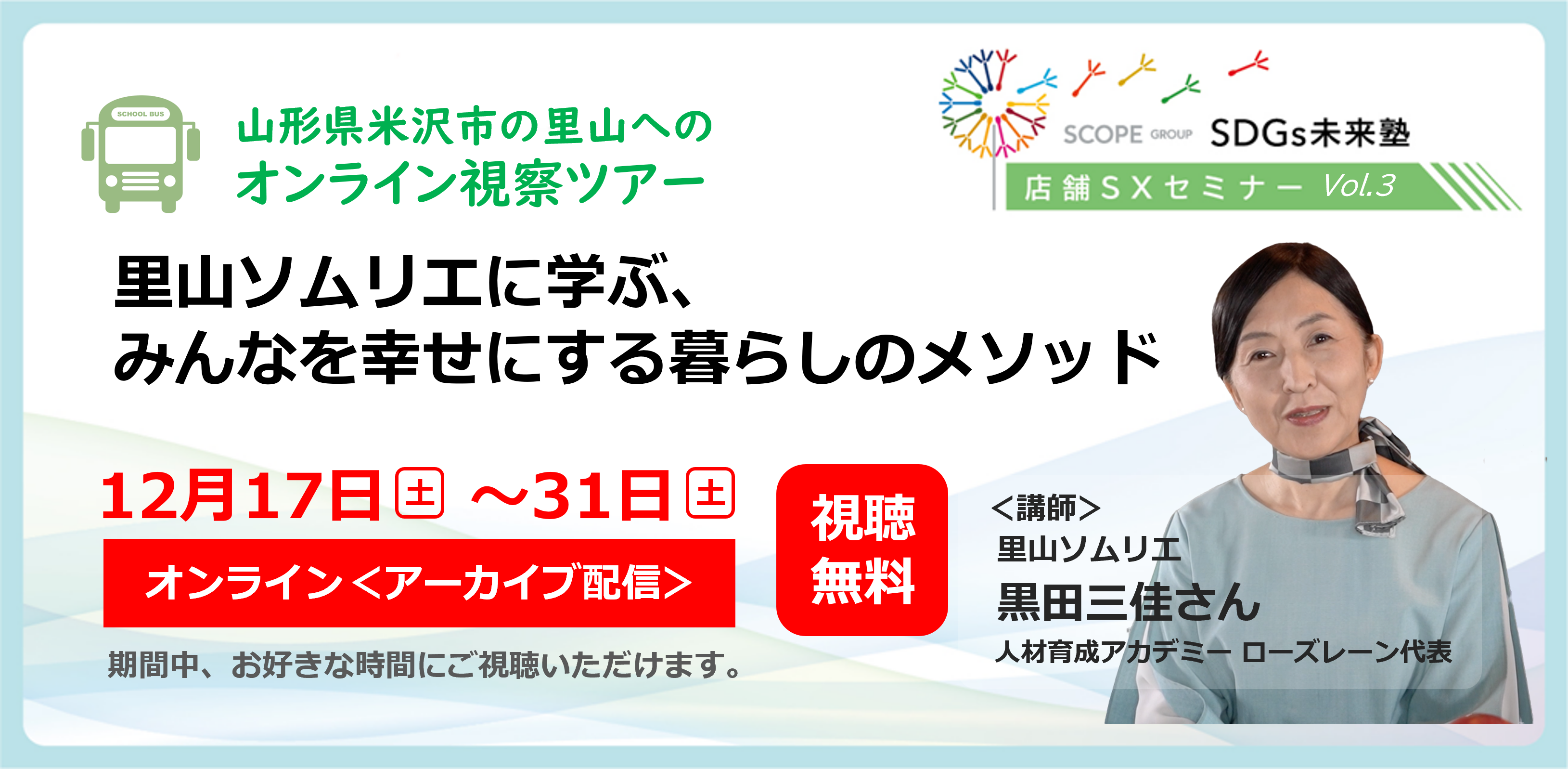 来る12月17日~12月31日に開催する「第3回 店舗SXセミナー」は、里山へのオンライン視察ツアーを企画。里山ソムリエの黒田三佳氏をお招きし、里山の暮らしでのSDGsに対する基本的なポリシーを学びます。小売店舗様とお客様双方のSDGsへの取り組み方にアイデアをもたらすメソッドを紹介していただきます。