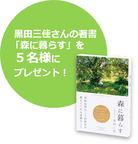 黒田三佳さん書籍「森に暮らす」を、抽選で5名様にプレゼントさせていただきます。ご視聴後のアンケートにて、「応募する」をお選びください。雪国山形の二十四節気に寄り添って、毎日の生活をちょっと楽しくちょっと幸せにするサステナブルなレシピ本です!