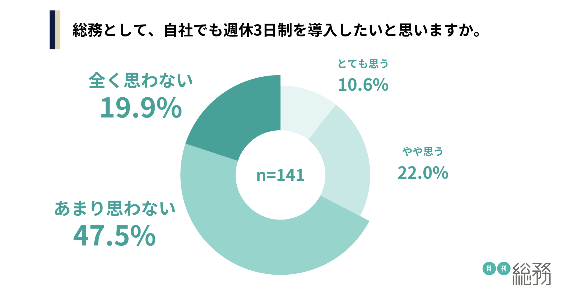 総務として、自社でも週休3日制を導入したいか尋ねたところ、「とても思う」が10.6%、「やや思う」が22.0%、「あまり思わない」が47.5%、「全く思わない」が19.9%という結果になりました(n=141)。