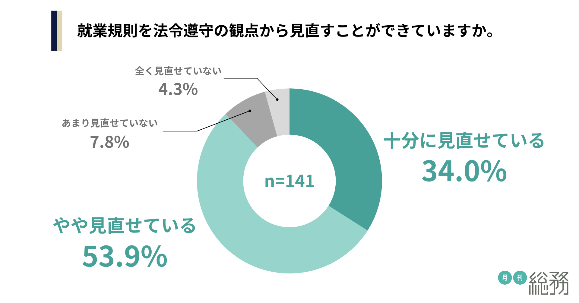 就業規則を法令遵守の観点から見直すことができているか尋ねたところ、「十分に見直せている」が34.0%、「やや見直せている」が53.9%と、合わせて87.9%の企業が見直せていることがわかりました(n=141)。