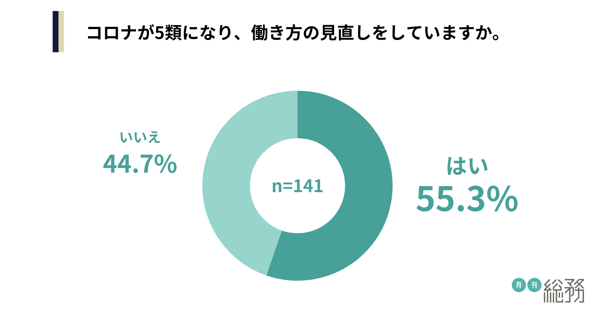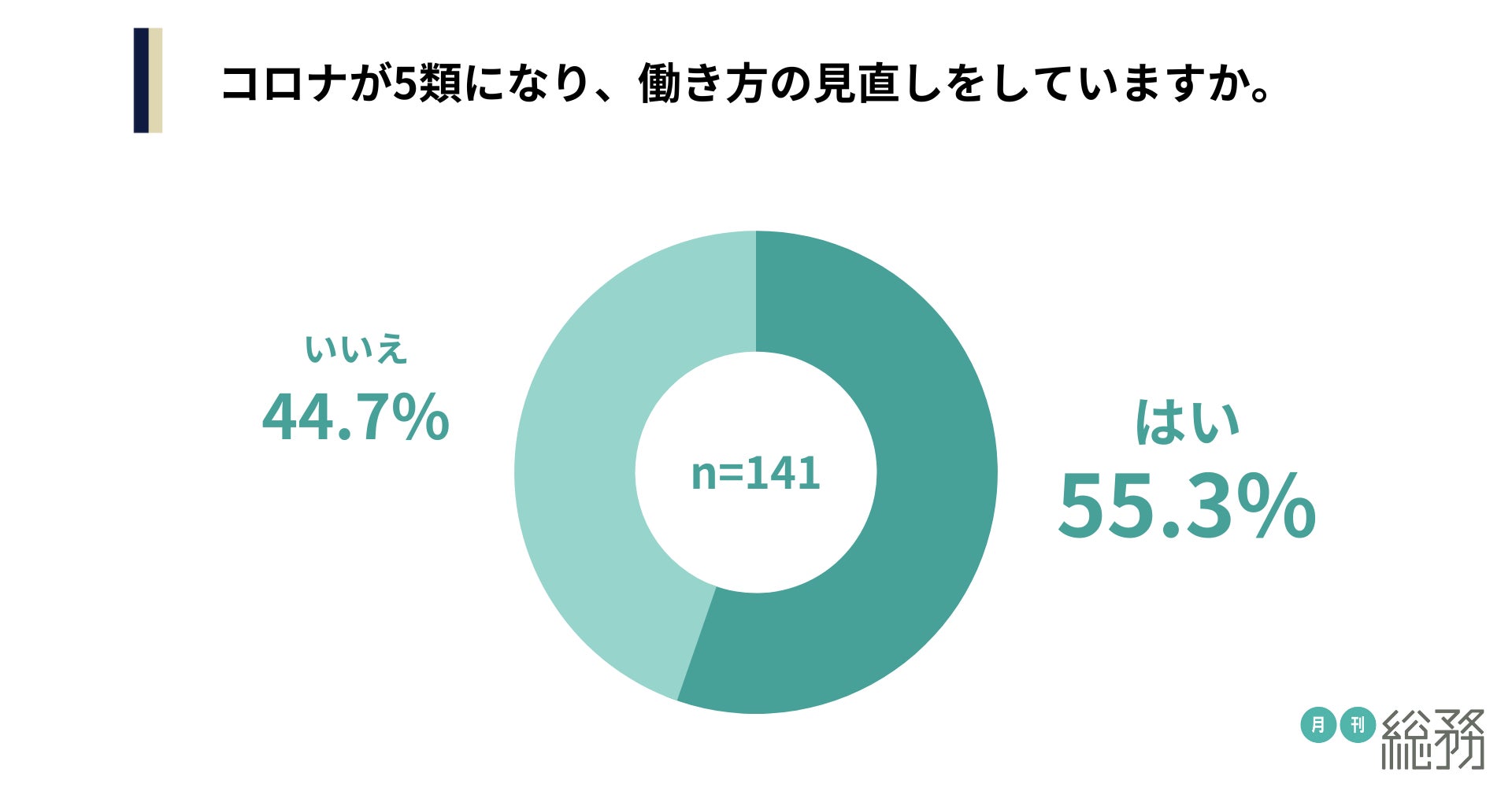 コロナが5類になり、働き方の見直しをしているか尋ねたところ、「はい」が55.3%、「いいえ」が44.7%という結果になりました(n=141)。