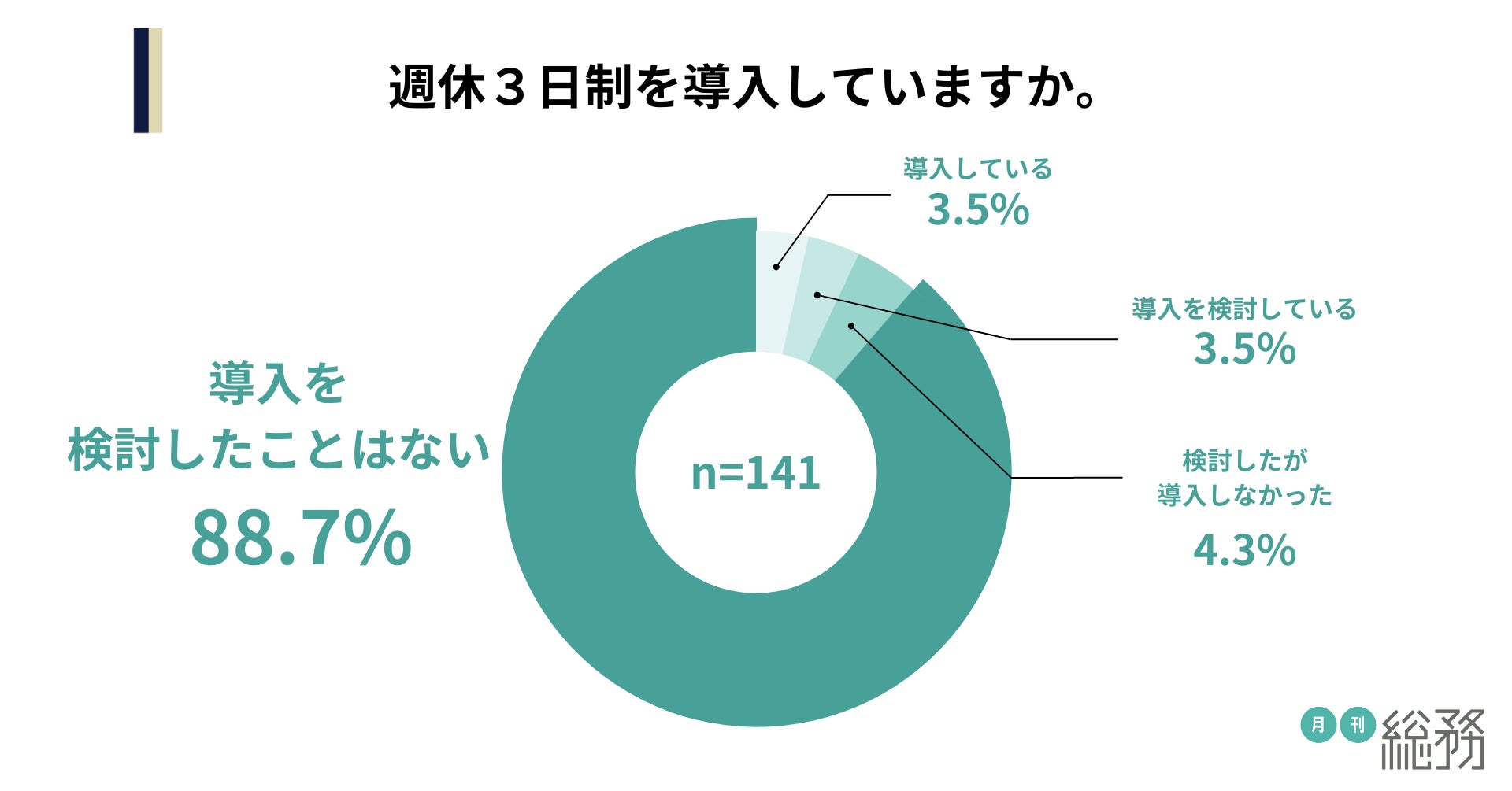 週休3日制を導入しているか尋ねたところ、「導入している」が3.5%、「導入を検討している」が3.5%、「検討したが導入しなかった」が4.3%、「導入を検討したことはない」が88.7%という結果になりました(n=141)。