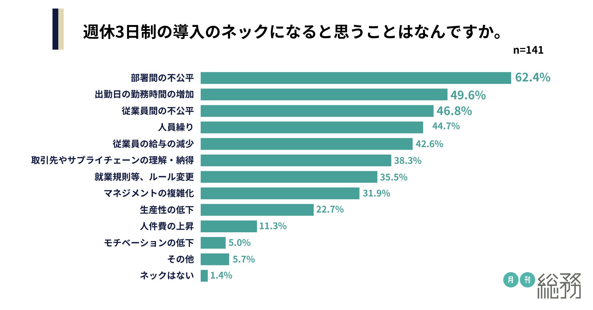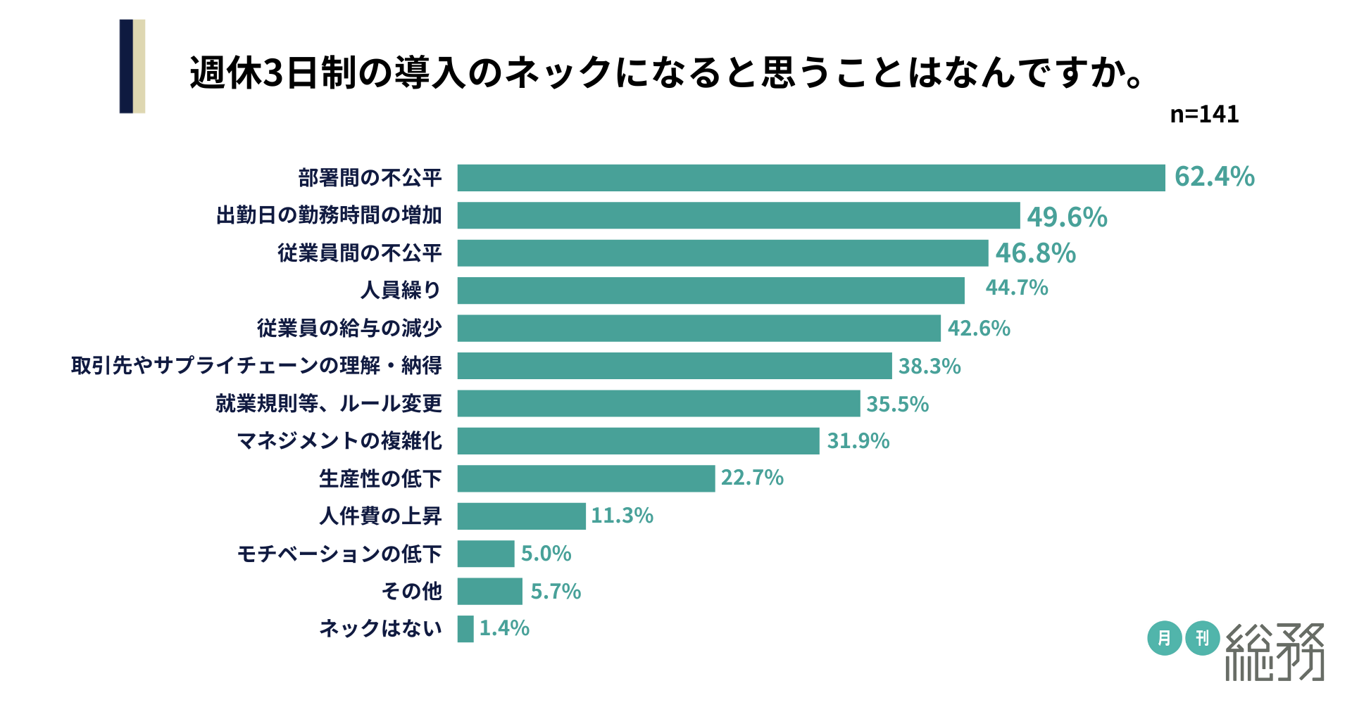 週休3日制の導入のネックになにか尋ねたところ、「部署間の不公平」が62.4%、「出勤日の勤務時間の増加」が49.6%、「従業員間の不公平」が46.8%と続きました(n=141)。