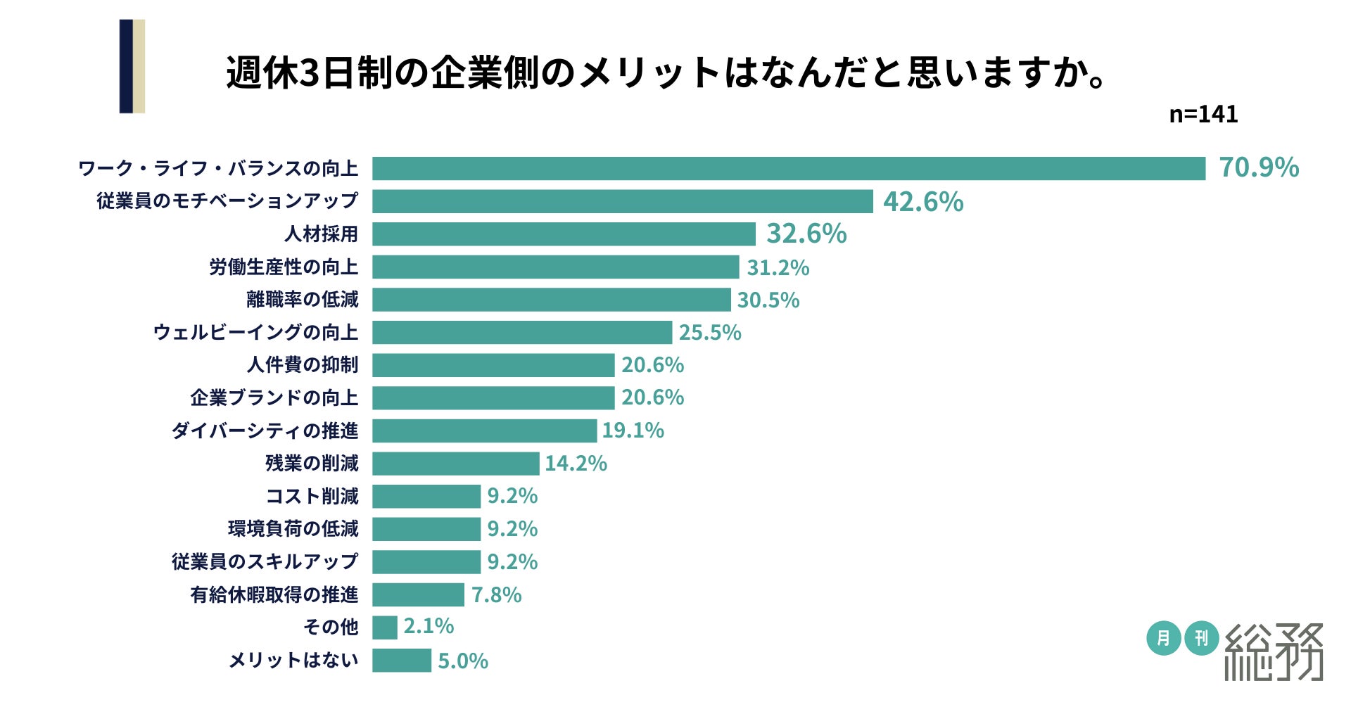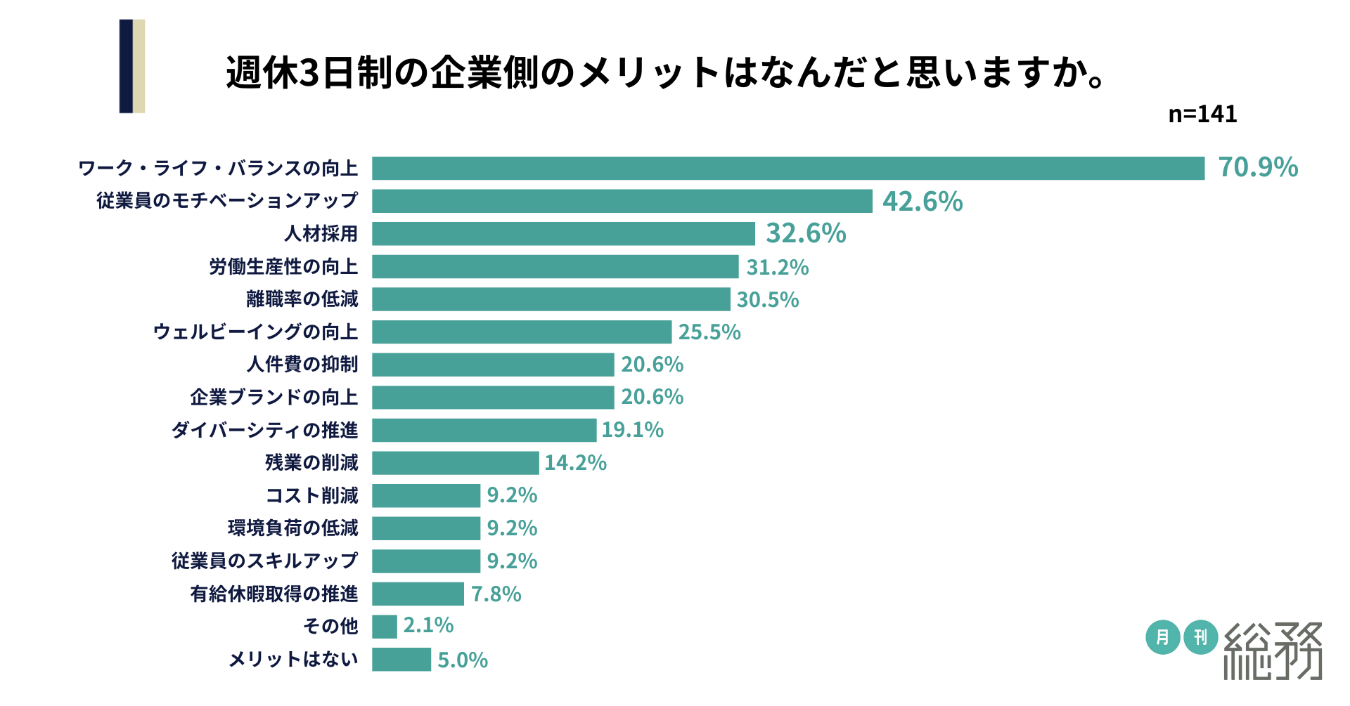 週休3日制の企業側のメリットはなにか尋ねたところ、「ワーク・ライフ・バランスの向上」が70.9%、「従業員のモチベーションアップ」が42.6%、「人材採用」が32.6%と続きました(n=141)。