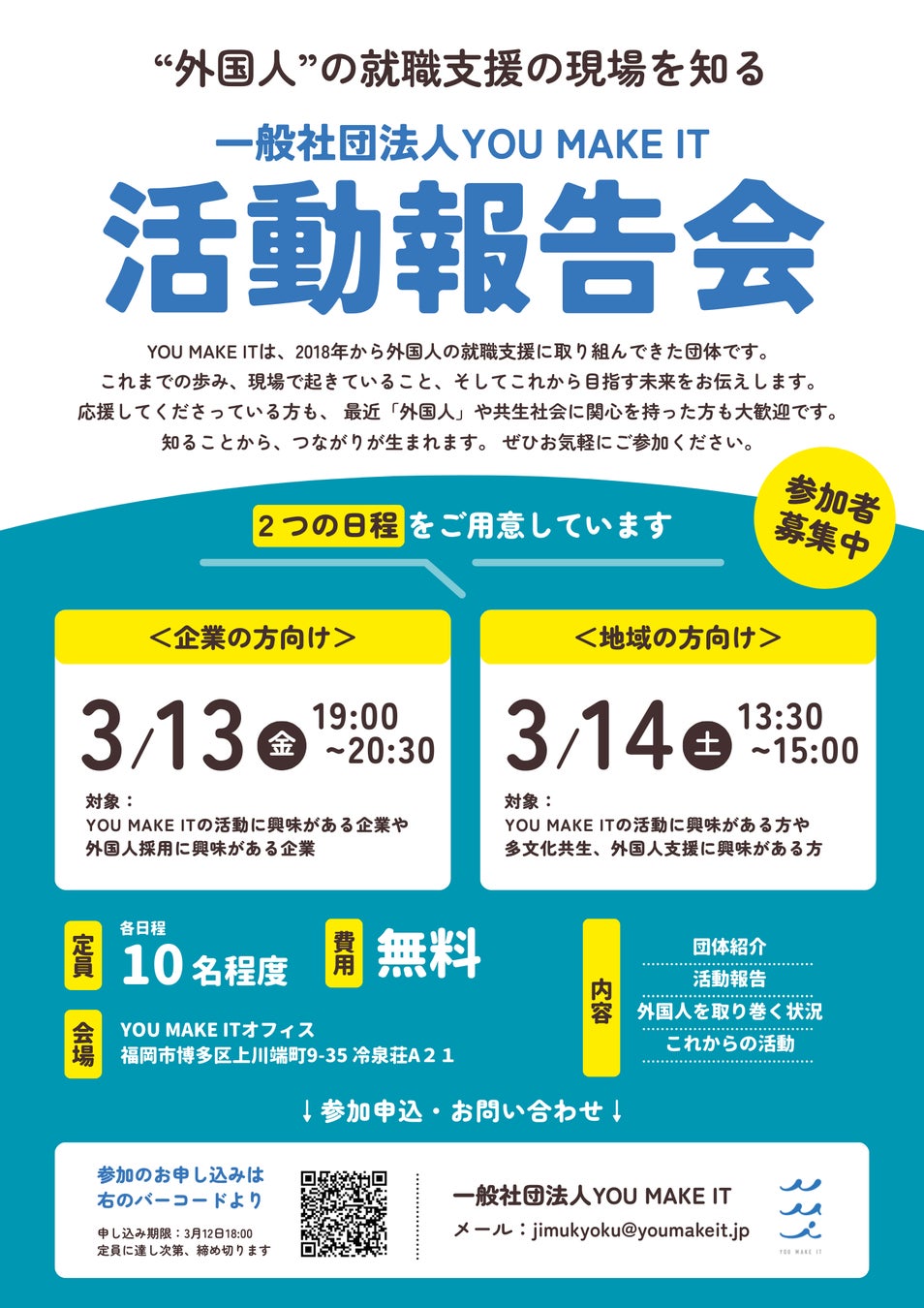 福岡県福岡市を中心に外国人のキャリア・就労支援を展開する一般社団法人YOU MAKE IT(本社:福岡県福岡市、代表理事:楳木健司)は、2026年3月13日(金)・14日(土)の2日間、団体設立以来初となる「活動報告会」を自社オフィス(冷泉荘)にて開催いたします。