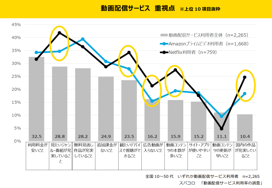 「Amazonプライム・ビデオ」と「Netflix」で差が出て点としては、いずれも「Netflix」利用者で『見たいジャンルの・番組が充実していること』、『観たいデバイスで視聴ができること』、『広告動画が入らないこと』、『動画コンテンツの本数が多いこと』、『国内の作品が充実していること』を重視する人が多いことがわかります。作品の充実度や視聴環境へのこだわりが強い人が「Netflix」を選ぶ傾向があることがうかがえます。
