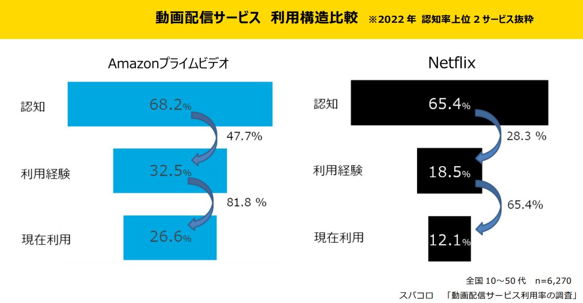 また認知から利用経験での歩留まり(トライアル率)では「Amazonプライム・ビデオ」が47.7%、「Netflix」が28.3%。利用経験から現在利用での歩留まり(継続率)では「Amazonプライム・ビデオ」が81.8%、「Netflix」が65.4%という結果に。