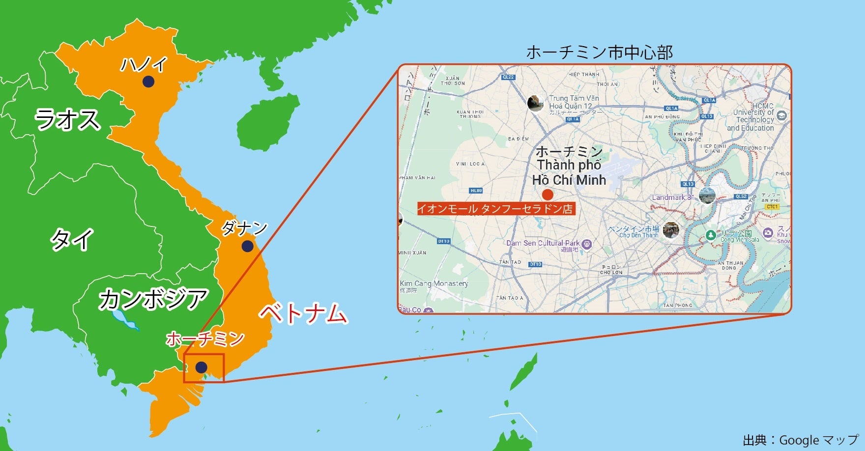 ベトナムでの第1号店は、ホーチミン市にある「イオンモール タンフーセラドン」に出店いたしました。「セラドンシティ」は、現地の主要空港であるタンソンニャット国際空港のすぐ西に位置する総面積82haの広大な敷地に、住宅・商業施設・学校・病院などが集積された大規模複合都市です。その中の代表的な施設である「イオンモール タンフーセラドン」は、2014年にイオンモールのベトナム1号店としてオープンし、2019年の大規模リニューアルにおいて、施設規模を約2倍に増床し、ファミリー層や若者を中心に、ホーチミン市内でもトップクラスの集客実績を誇る人気の施設となっています。