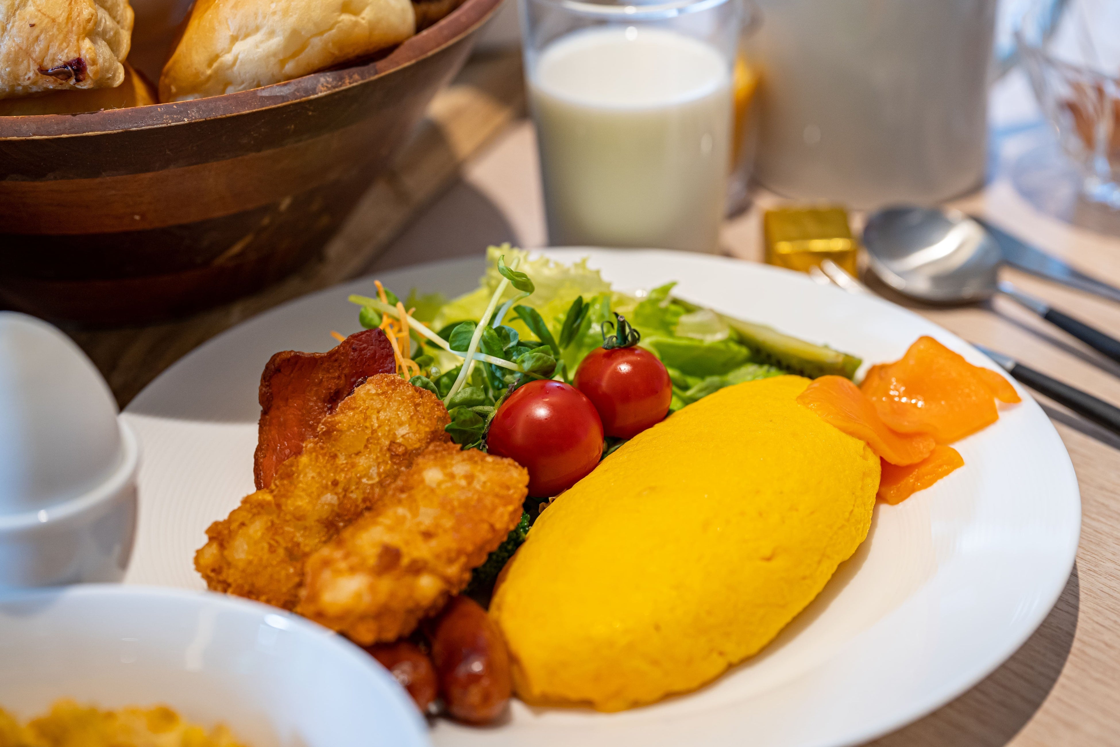 [ホテル出発まで] シェフたちがオープンキッチンで焼き上げるのは、日替わりでご用意する具材を使ったオムレツ。わさびやチーズなど様々なカスタマイズを楽しめる。
