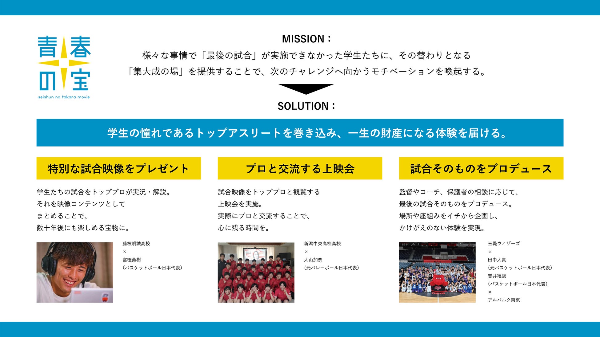 コロナ禍に生まれたアスリート魂の連鎖反応と輪。新型コロナウィルスで3年強にわたり、日常を奪われた中・高・大学生。特にチームスポーツは、特定の時期に特定のメンバーとしか味わえない体験を逸する機会となりえたが、先輩アスリートたちの心意気で青春を一生の思い出に変えた取り組み。プロ達の協力で映像として強烈な思い出を残し、強烈な思い出は次世代への恩送りをするきっかけとなる。10年後のスポーツ界を支える人材を確実に生み出していると確信する。ピンチの時に、動ける大人。青春を残すだけでない価値を感じた。