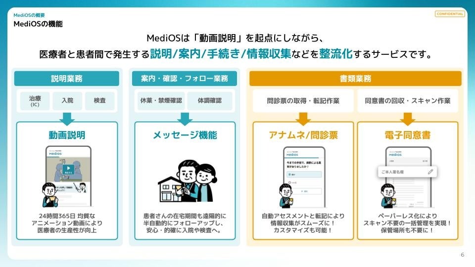 メディオスは手術・麻酔・検査・入院等の定型的な患者説明をアニメーション動画で再現する「動画説明」に加えて、「電子問診/アナムネ」「電子同意書」「患者メッセージ」をワンストップで提供し、診療科横断で、医療者・患者間の情報整流化を実現します。