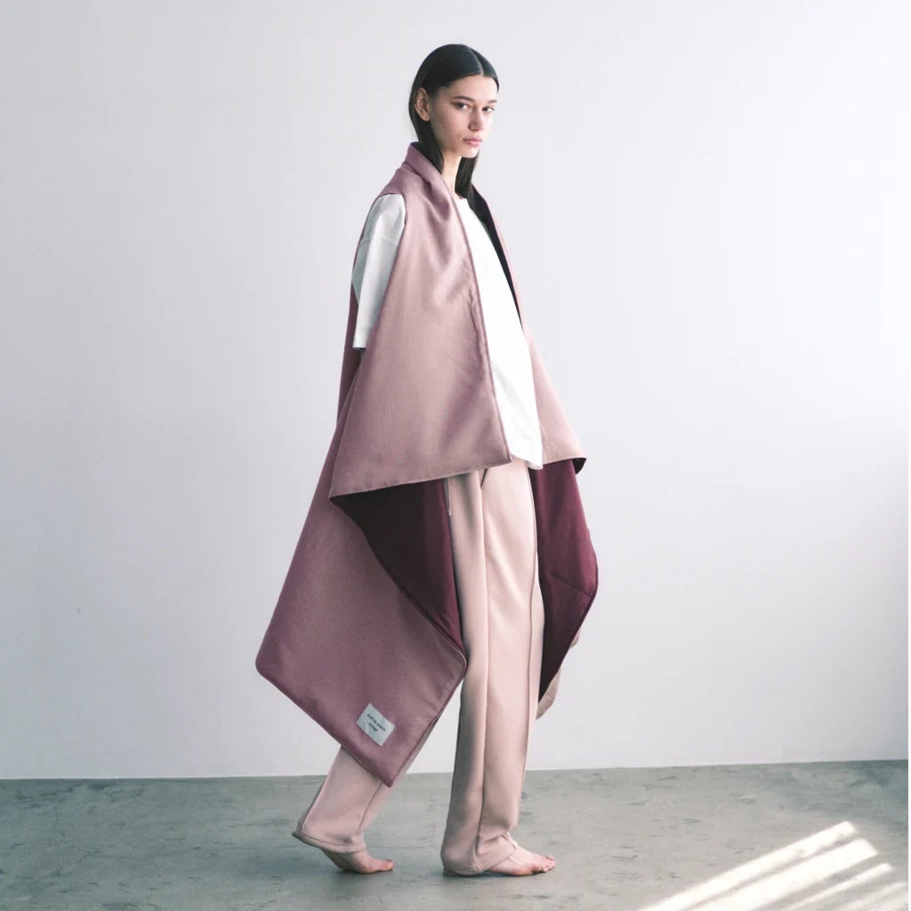 ジレのように羽織れるブランケット。さっと羽織れば、そのまま出かけたくなるドレープが印象的なデザイン。家具にも馴染みやすいカラーリングで、ソファにかけてインテリアとしても。