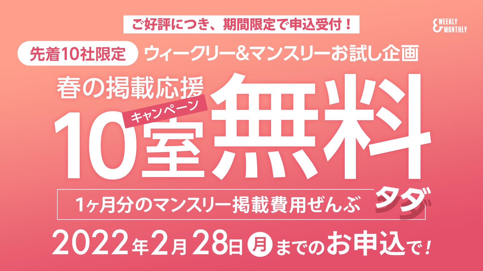 先月(2022年1月)開催し、大変好評の内に申込受付終了となった「先着10社限定×ウィークリー&マンスリーお試し企画 春の掲載応援10室無料キャンペーン」(https://weeklyandmonthly.co.jp/news/20220107/)。