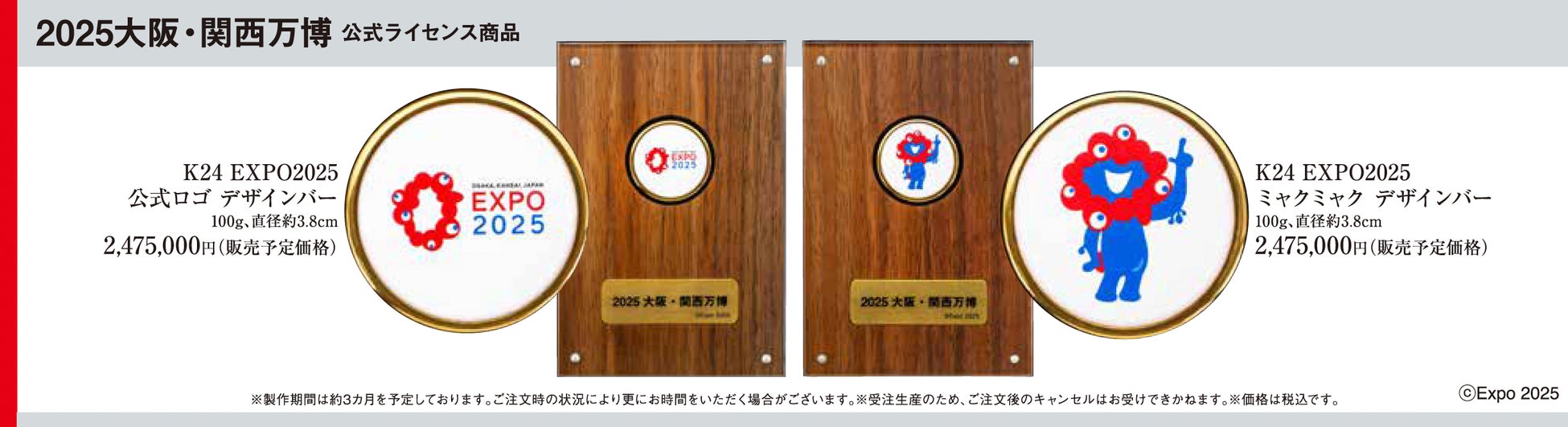 ⼯芸品が勢揃いしています。また、「 2025大阪・関西万博」の公式ラインセンス商品で、万博ロゴマークや公式キャラクター「ミャクミャク」のK24 デザインバーを受注販売いたします。