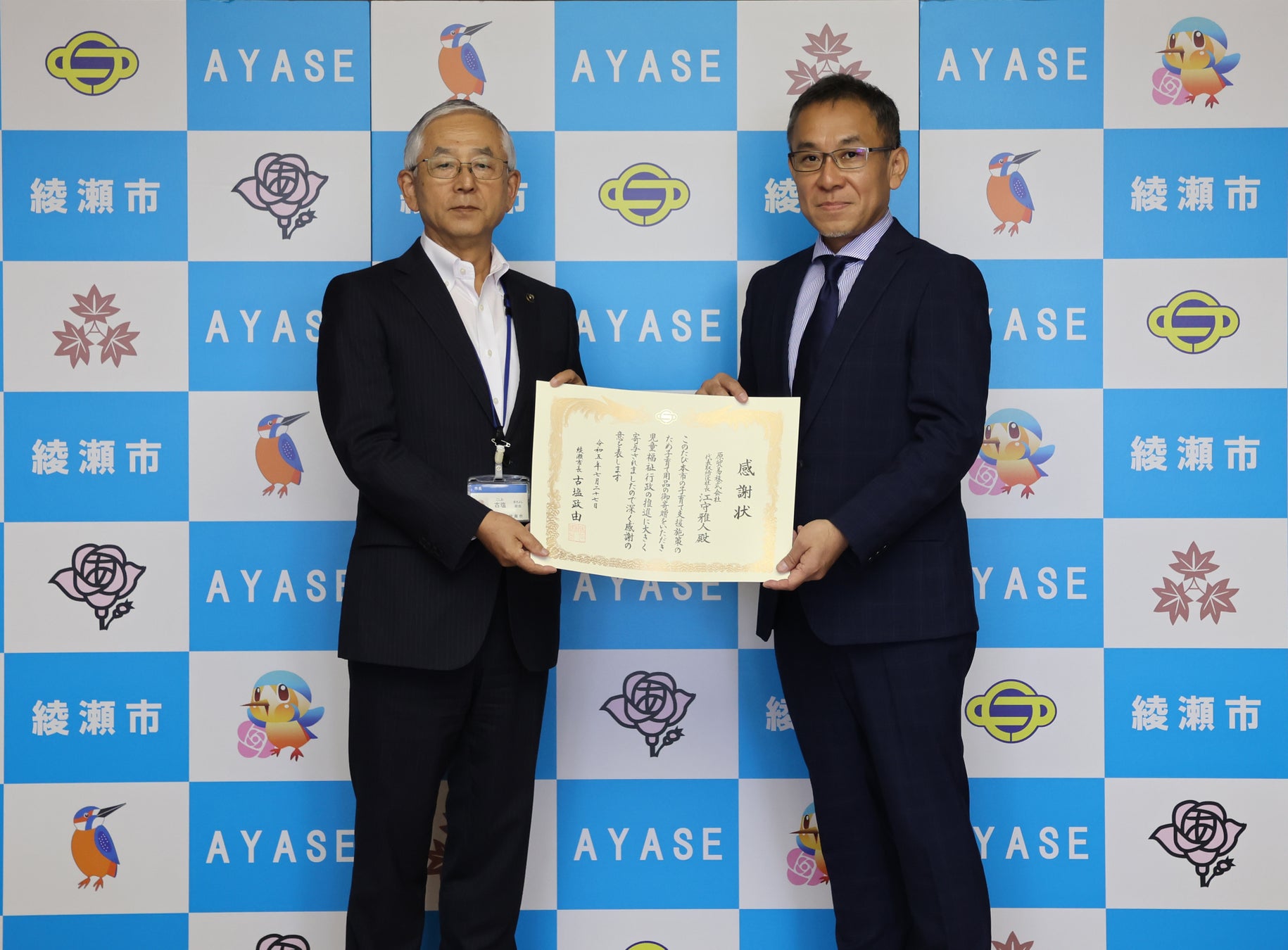 当社の物流センターが綾瀬市にあることから、地域に役立つ活動をしたいと考え、子どもに優しい街を目指す綾瀬市の子育て支援センターへ当社が取り扱う子育てグッズを寄贈しました。このことが評価され、2023年7月27日に綾瀬市役所にて表彰いただきました。当社から寄贈した抱っこ紐やカトラリーなどの子育てグッズは、子育て支援センターで実施する講座の参加者のみなさんへの配布などで活用いただく予定です。