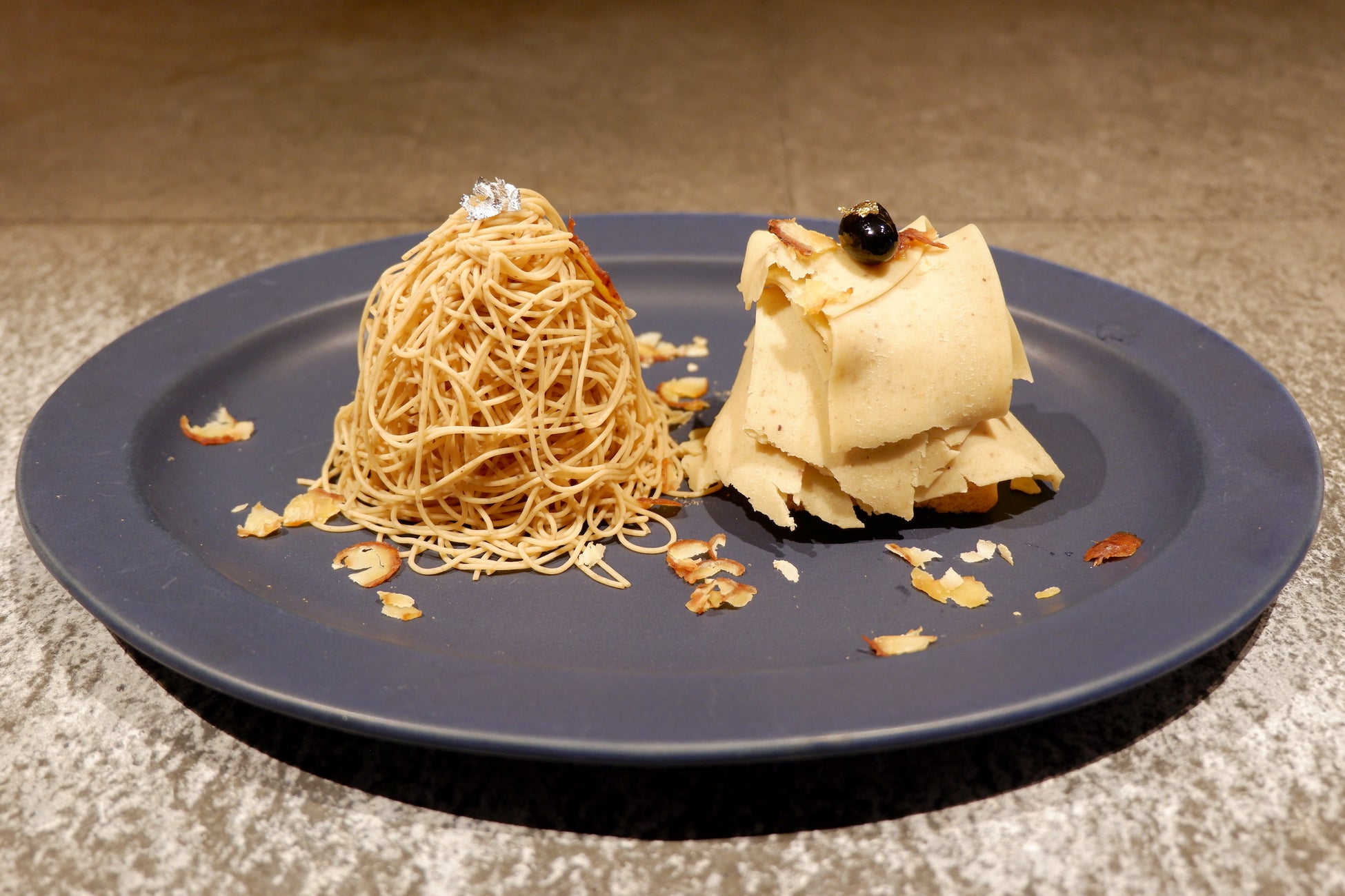それぞれ2つの産地の栗を使ったモンブランを1皿で提供。細さ1ミリの錦糸状に絞ったモンブランと、厚さ1ミリの帯状に絞ったモンブランに分けることで、舌触りの違いによる風味の差を楽しんでいただけます。