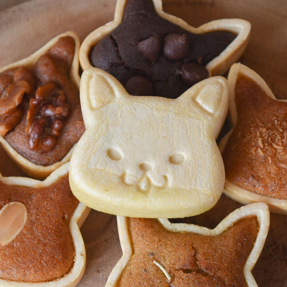 ヴィーガン&グルテンフリーのお菓子の専門店。愛くるしい表情のネコちゃんのフィナンシェパイがおすすめです。