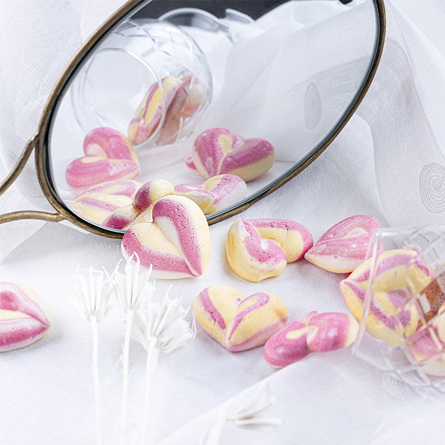 ヴィーガン&グルテンフリー&ナッツフリーで、アレルギーっ子のミカタのケーキショップ。赤ビート色素とクチナシ色素で可愛く色付けした、ハート型のメレンゲクッキーがおすすめです。
