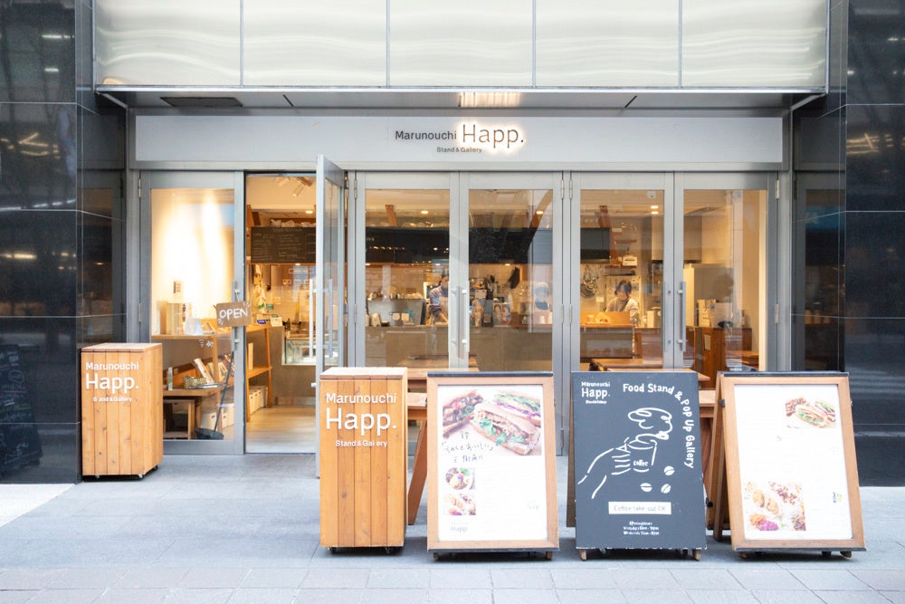 「Marunouchi Happ. Stand&Gallery」は、ポップアップギャラリーとフードスタンドが融合した、丸の内仲通りにある小さなカフェスタンド。株式会社と三菱地所株式会社が共同企画・運営を行っている。「新たな賑わい創造の拠点」として2018年5月に誕生。気軽にデイリーユースできるカフェでは、丸の内という街が大切にしてきたEssenial(「本物・本質」)をキーワードとして、こだわりのフードやドリンクを提供。旬な野菜がたっぷり詰まった手作りサンドイッチや、熟練の醸造家が丹精込めて仕込むクラフトビール、原産地の個性を大切に自家焙煎したスペシャリティーコーヒーが人気。