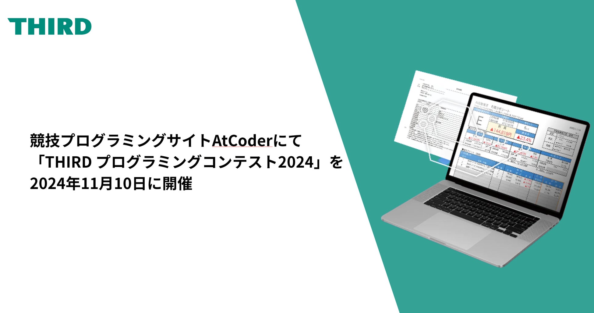 不動産・建築業界向けのAI開発を手掛ける株式会社THIRD(本社:東京都新宿区、代表取締役:井上惇、以下、当社)は、2024年11月10日に日本最大の競技プログラミングサイトAtCoder内で 「THIRD プログラミングコンテスト2024」を開催します。本コンテストは、ABC/ARC/AGCなどのアルゴリズムコンテストと異なり、最適解を出すのが難しい問題に対し、出来るだけ良い解を作成するAtCoder Heuristic Contestになります。