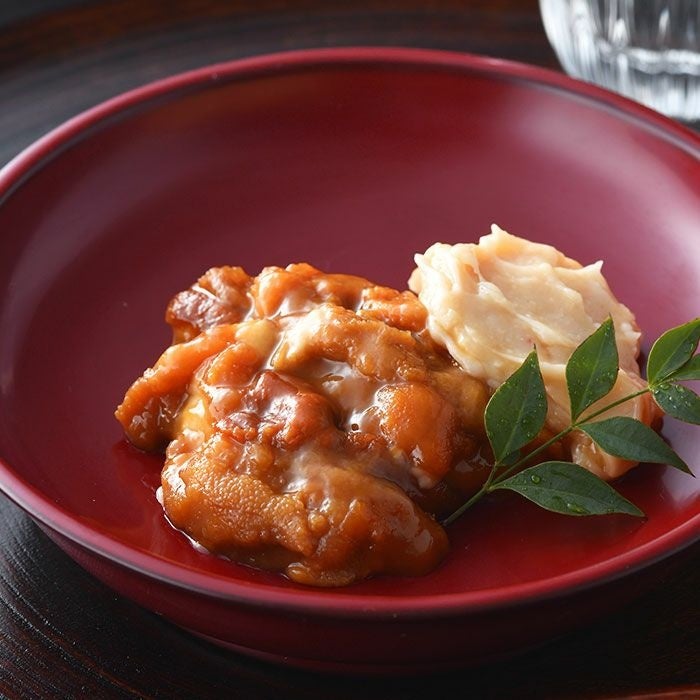 アルコール漬けにした下関伝統の粒ウニは、生とは異なる独特の風味と濃厚な口あたりが魅力。そこに、山口県の純米大吟醸の酒粕を添えることで上品で柔らかな香りが合わさり、絶妙な旨さに仕上がっている。それぞれを味わうもよし、両者を絡めてもよし。酒のアテとしてはもちろん、ご飯のお供にも。