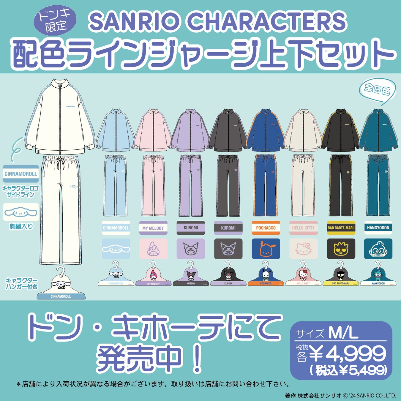 サイドにサンリオキャラクターズ配色ロゴ・ラインが入った長袖トラックジャケットとロングパンツの上下セット。各キャラクターのイメージを落とし込んだカラーリングがとってもCUTE❤。お友達や恋人とオソロコーデを楽しんでみて下さい! ※専用ハンガー付き