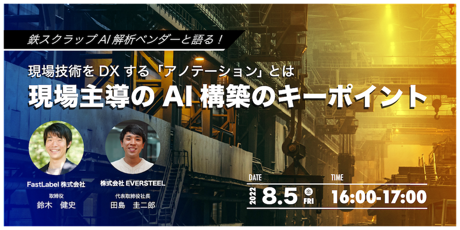 AI革命のインフラを目指すFastLabel株式会社(本社:東京都品川区、代表取締役CEO:上田英介、以下「FastLabel」)は、鉄スクラップ解析システムの開発・提供を行う株式会社EVERSTEEL(本社:東京都文京区、代表取締役:田島圭二郎、以下「EVERSTEEL」)と、共催セミナー「鉄スクラップAI解析ベンダーと語る!現場技術をDXする『アノテーション』とは現場主導のAI構築のキーポイント」を2022年8月5日(金)にオンラインで開催いたします。