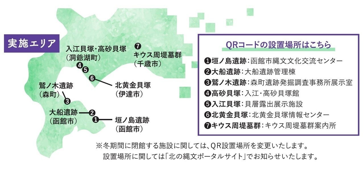 場所 | 道内7か所の遺跡群 【垣ノ島遺跡(函館市)、大船遺跡(函館市)、北黄金貝塚(伊達市)、入江貝塚 (洞爺湖町)、高砂貝塚(洞爺湖町)、キウス周堤墓群(千歳市)、鷲ノ木遺跡(森町)】 |