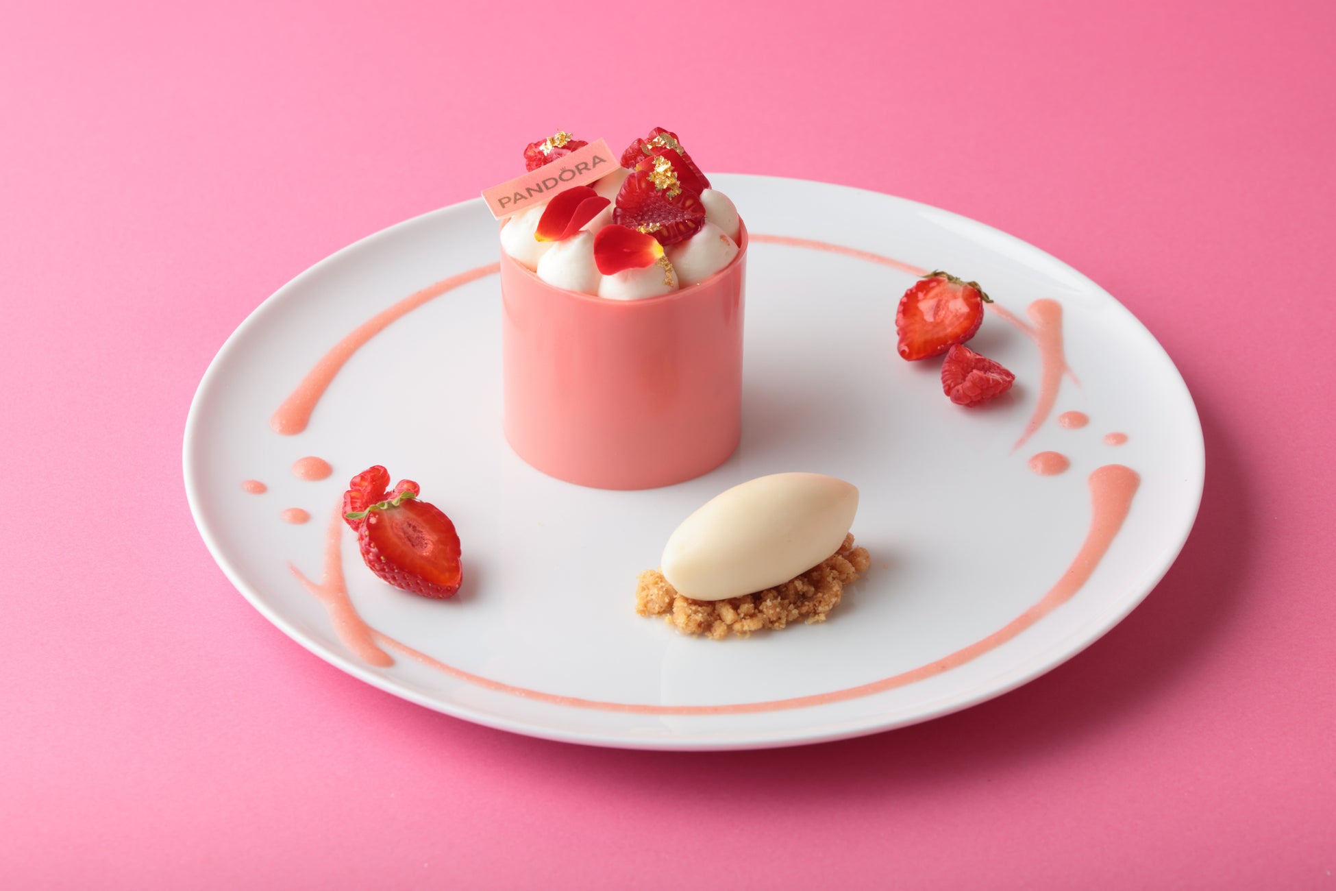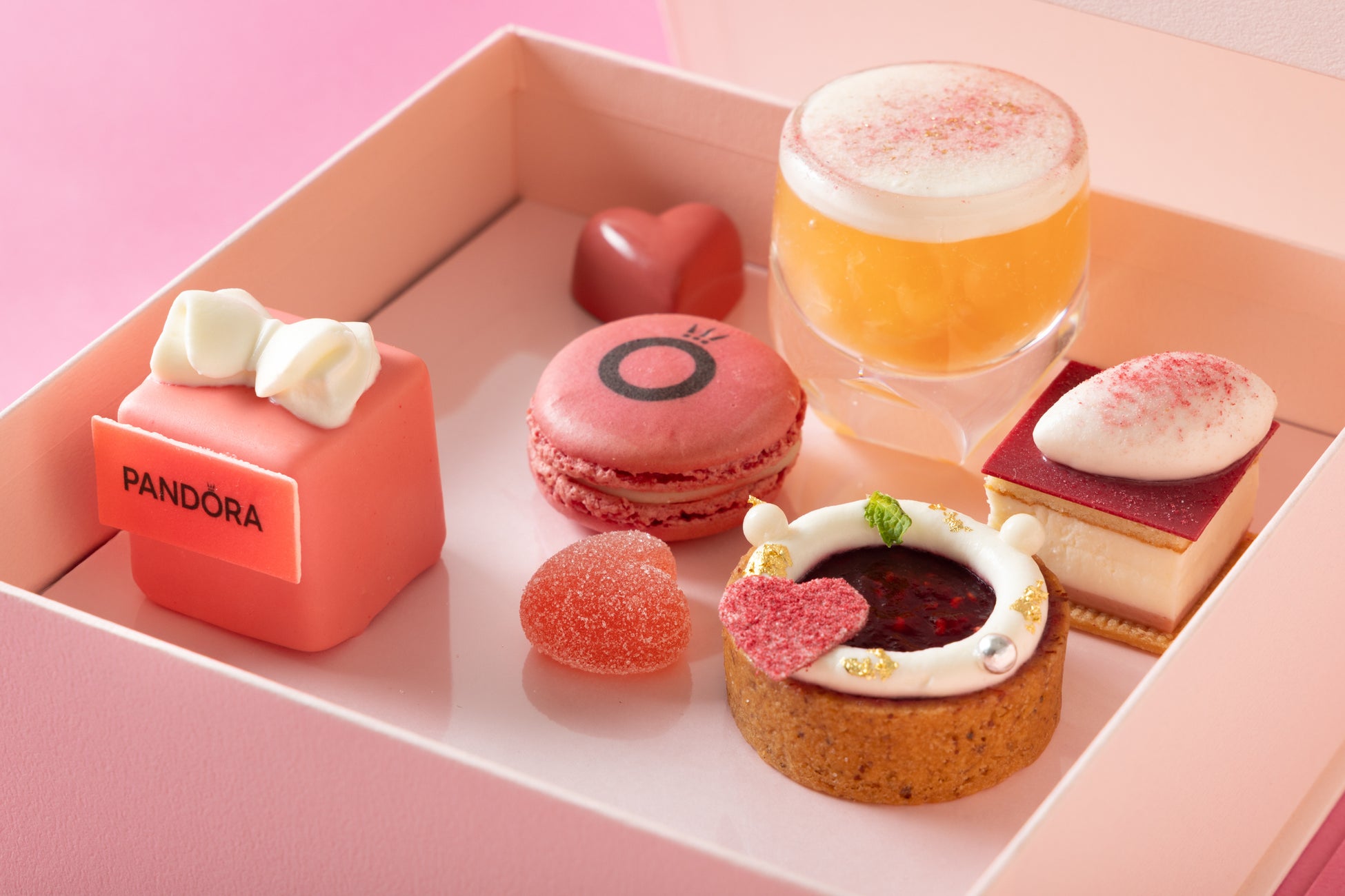 本アフタヌーンティーでは、パンドラの象徴でもあるピンクのジュエリーボックスを模した特製ボックスに、7種のスイーツと4種のセイヴォリーを詰め込み、まるでジュエリーのように輝くメニューをご用意しました。