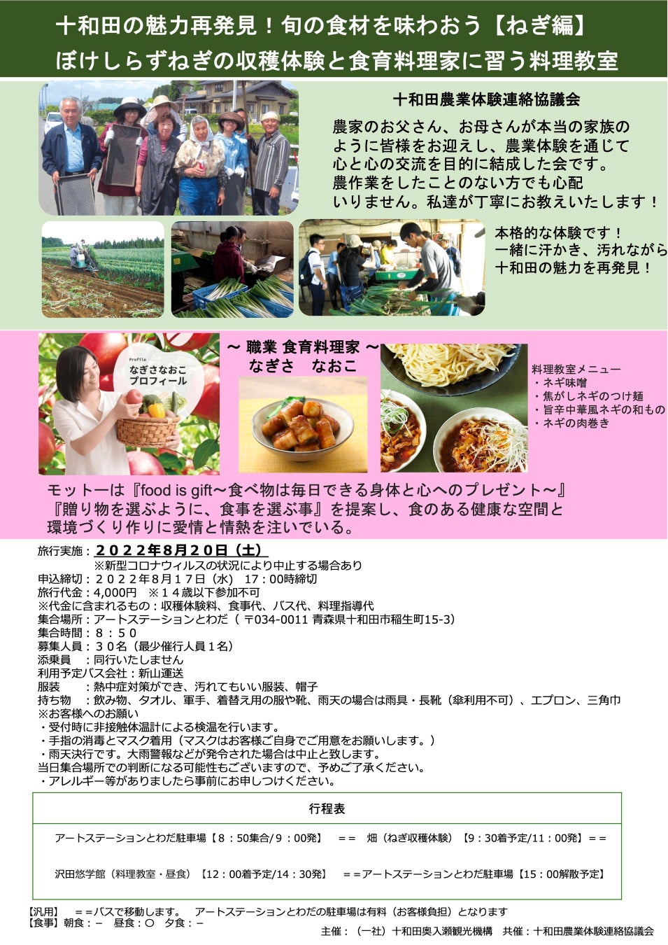 こういった魅力的な食材を、十和田農業体験連絡協議会の作業指導のもとで汗をかきながら収穫し、食育料理家であるなぎさ なおこの教室で調理に使うのがツアーの内容です。ねぎ味噌、旨辛中華風ねぎの和えもの、ねぎの肉巻き、焦がしねぎのつけ麺、自ら作った健康な昼食メニューを味わって、農業資源が豊かな十和田市の素晴らしさを再発見いただければ幸いです。