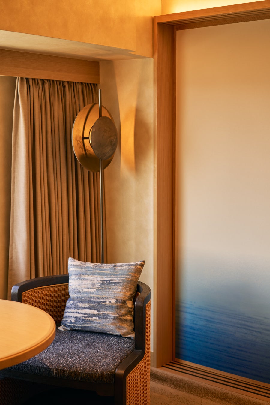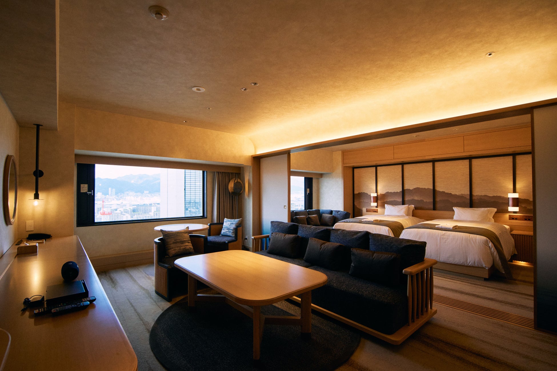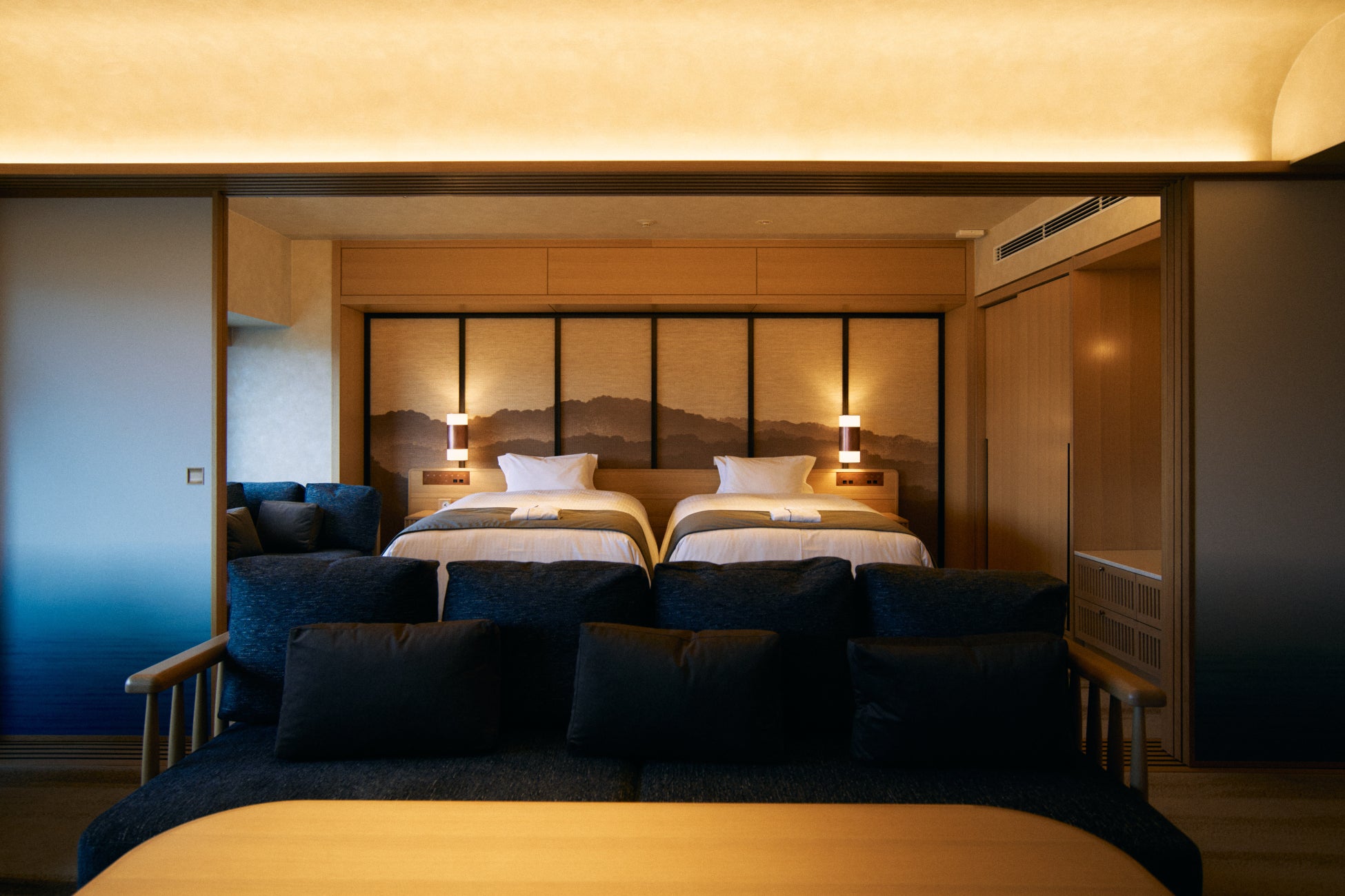 神戸の山並みや海をデザインに反映したという内装は、お部屋の中にいながら神戸の自然を感じることができる空間となっていて、近年、海外でも人気のデザインスタイル『ジャパンディ』の要素が取り入れられています。