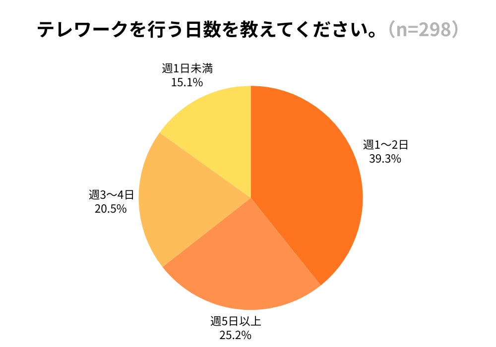 また、週あたりのテレワーク実施日数は、「週1~2日」が117人(39.3%)と最も多く、次いで「週5日以上」75人(25.2%)、「週3~4日」61人(20.5%)となりました。この結果から、週3日以上のテレワークを実施している人は全体の約46%に達していることがわかります。