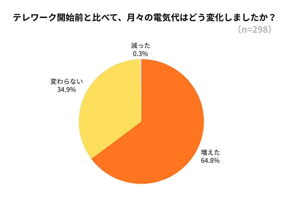 テレワーク開始前と比較した月々の電気代の変化について調査したところ、「増えた」が193人(64.8%)と約3分の2に達し、「変わらない」は104人(34.9%)、「減った」は1人(0.3%)という結果になりました。