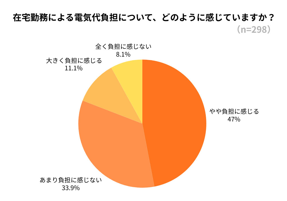 約65%が電気代の増加を実感している一方で、約35%は変化を感じていないことから、テレワーク環境や勤務頻度、住居の断熱性能などによって個人差が大きいことがうかがえます。