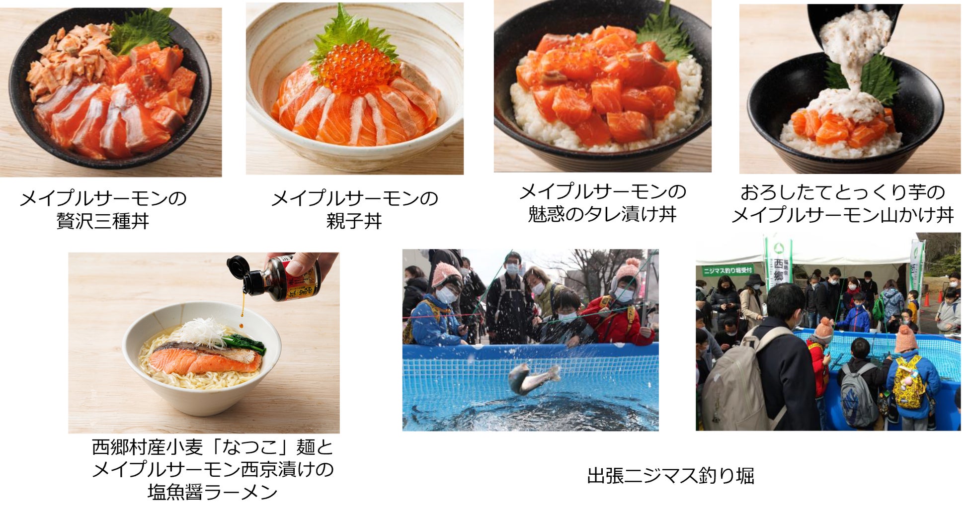 福島県の玄関口に位置し、豊かな自然に恵まれ、首都圏からのアクセスも抜群の福島県西郷村が出店。西郷村は日本の〝村〟としては唯一、新幹線の駅があり、魅力的な観光スポットやおいしいグルメも盛りだくさんです。阿武隈川の清流で丹精込めて育てられた「メイプルサーモン」の海鮮丼のほか、新たにメニュー開発した、「西郷村産小麦『なつこ』麺とメイプルサーモン西京漬けの塩魚醤ラーメン」が新登場します。村の観光名所である「ますつり公園」の出張ニジマス釣り堀もお楽しみください。