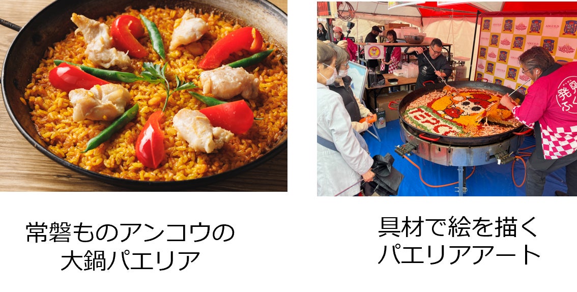 「エルトラゴン」ブースでは、「常磐もの」の冬の味覚の代表格であるアンコウをぜいたくに使って、東京・虎ノ門の人気スペイン料理店のオーナーシェフが腕を振るい、直径1.5メートルの巨大鍋で最大200人前を調理。具材で巨大鍋に絵を描くパエリアアートも披露します。
