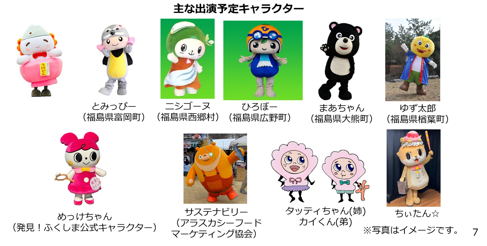 福島県各地のご当地&マスコットキャラクターたちが登場し、イベントを盛り上げます。会期中は会場を歩いたり、それぞれのブースで料理を売り込んだり、ステージにも登場します。