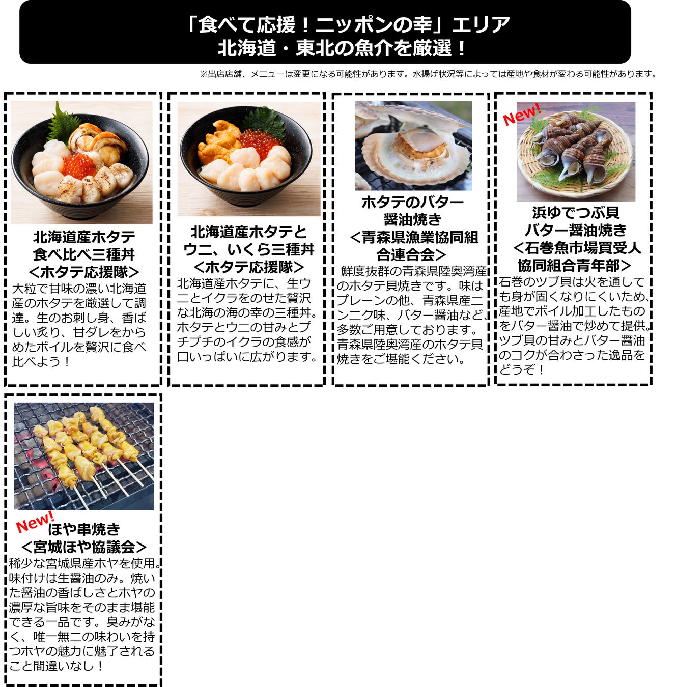 発見!ふくしまお魚まつりと連携し、北海道・東北地方の厳選した魚介料理を集めた「食べて応援!ニッポンの幸」エリアを設けます。一部の国・地域による日本の水産物の輸入規制の影響を受けたホタテなど、日本の海の幸のおいしさを発信し、日本の漁業・水産業を応援することを目的としています。