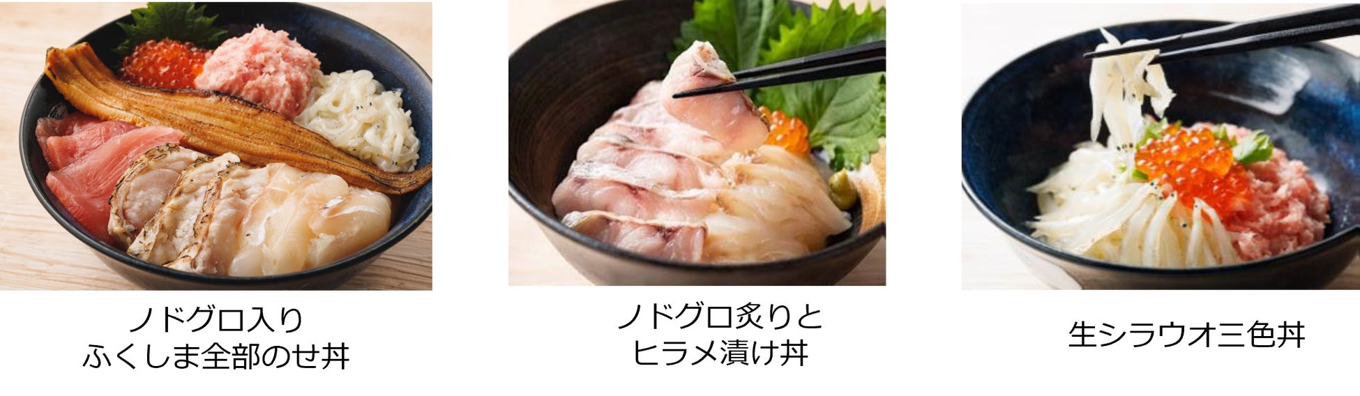「かに船ふくしま海鮮丼」ブースの目玉メニューが、「常磐もの」と呼ばれる福島の魚介を贅沢に盛った「ノドグロ入りふくしま全部のせ丼」。白身のトロと呼ばれるノドグロの炙り、「常磐もの」の代表格のヒラメの漬け、この時期にしか味わえない生シラウオ、脂ののったアナゴ、小名浜海星高校の生徒が練習船「福島丸」で漁獲したマグロの切り落としとネギトロに、イクラも添えて、7種をてんこ盛りに。お好みの魚介を味わえる「ノドグロ炙りとヒラメ漬け丼」「生シラウオ三色丼」もご用意。「常磐もの」を食べ尽くそう!※イクラは福島県産以外の食材を使用しています