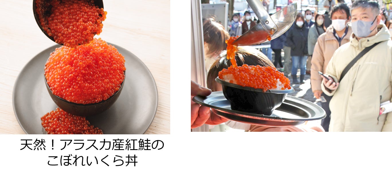 フェスで1番人気を争う名物メニュー「天然!アラスカ産紅鮭のこぼれいくら丼」。アラスカシーフードマーケティング協会と極洋の協力を得て、100%天然のおいしさを誇り、サステイナブル(持続可能)な漁業によって漁獲されたアラスカ産の紅鮭のイクラをご用意しました。〝紅子〟ともいわれる紅鮭のイクラは、ルビーのような色合いで、コクのある味わいととろけるような食感が特徴。丼から下皿に豪快にイクラがこぼれ落ちるパフォーマンスとともに、お楽しみください。