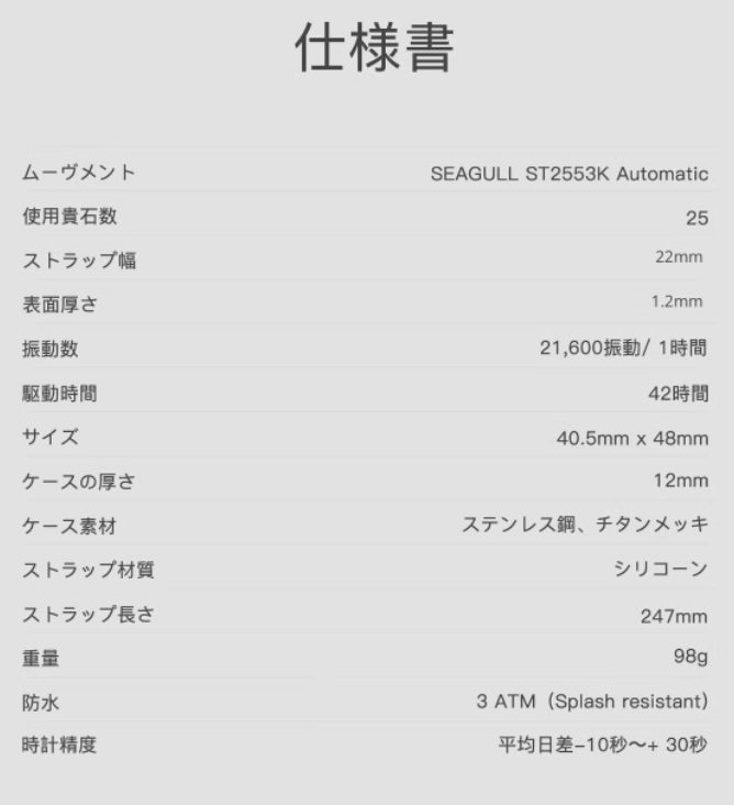 - 「3ATM生活防水」のSeagullオールAランクムーブメント