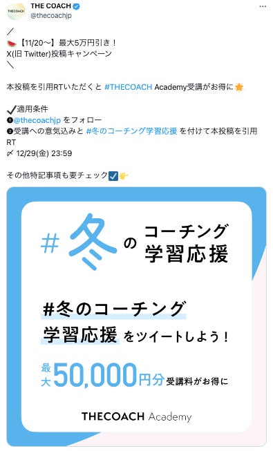 期間内に、THE COACH X(旧 Twitter)アカウント(https://twitter.com/thecoachjp )をフォローし、指定の投稿をリツイートいただくと、THE COACH Academy受講料最大5万円(税別)がお得になります。