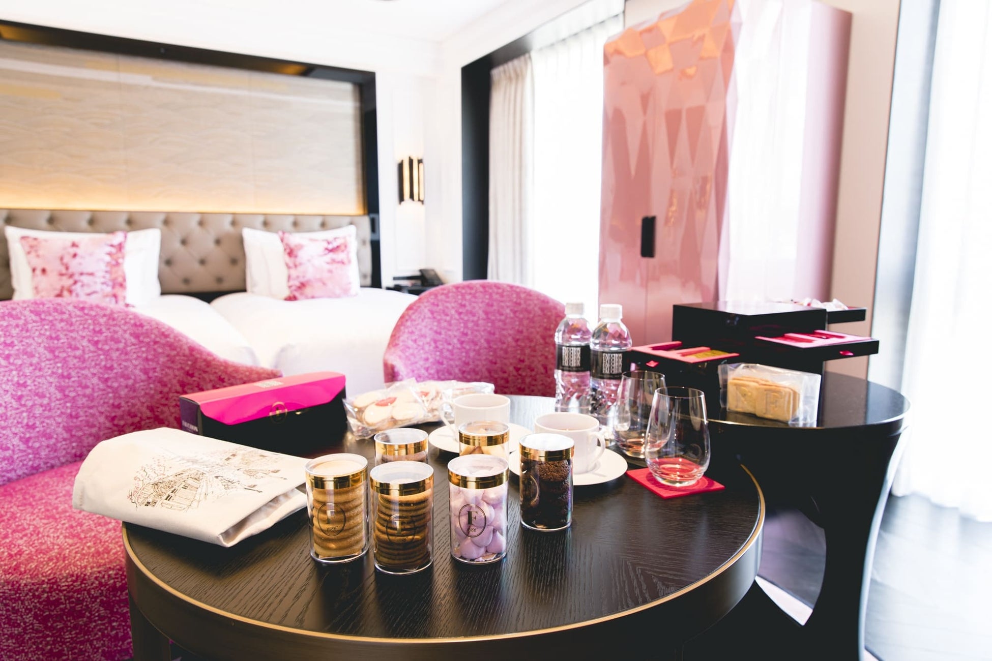 お部屋の中のシャンパンピンクのグルメバーの中には、フォションのスイーツが入っています。紅茶やコーヒーなどもご用意。食べきれなかった分はパリのデザイナーがフォションホテル京都の為だけに描き下ろしたオリジナルデザインのトートバックにいれてお持ち帰りも可能。他フォションショップやパリでも販売はしていない、フォションホテル京都ご宿泊者さまのみ入手可能アイテムです。