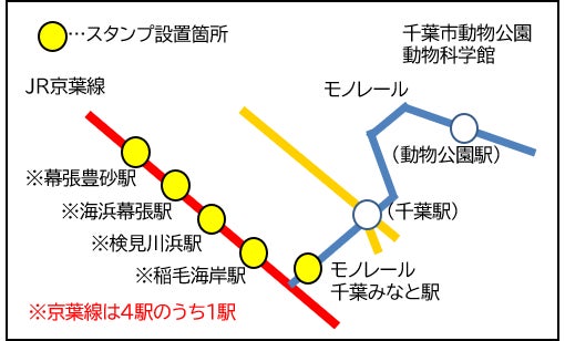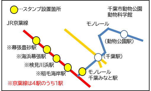 ペリエステーション4 駅(幕張豊砂駅、海浜幕張駅、検見川浜駅、稲毛海岸駅)、千葉市動物公園及びJR千葉支社管内の京葉線の駅で配布する専用のスタンプ台紙を受け取ってからご参加下さい。