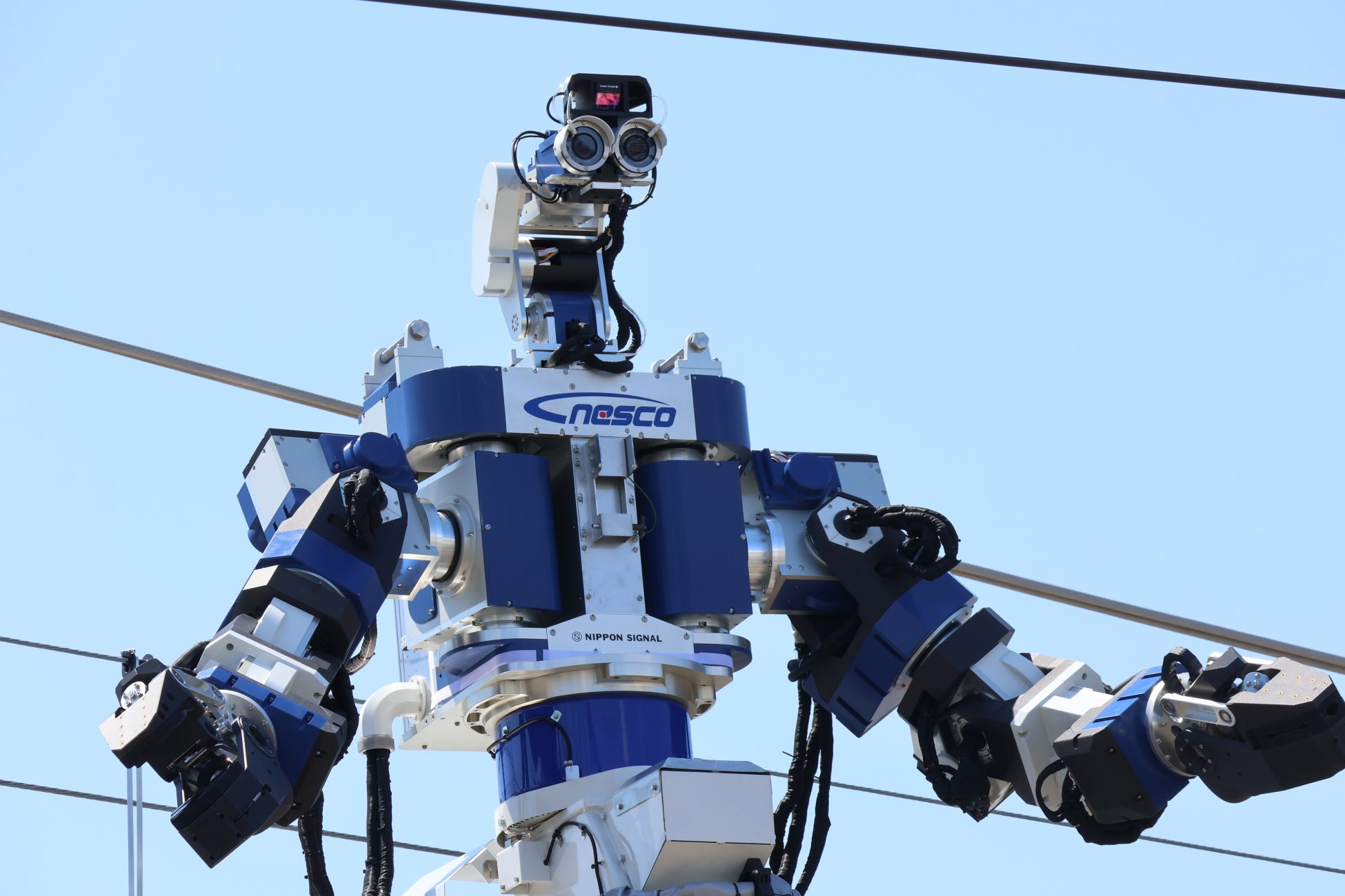 零式人機 ver.2.0 は、鉄道設備における高所重作業の解消を目的に、人機一体、JR 西日本、日本信号により共同研究開発された汎用人型重機です。「力制御・トルク制御技術」「パワー増幅バイラテラル制御技術」などの人機一体独自の先端ロボット工学技術が搭載されています。鉄道工事車両(高所作業車)のブーム先端に人型重機が搭載されており、操作者は安全な場所に設置された操縦席から人型重機を遠隔操作することで、人が危険な高所に登ることなく高所重作業を行なうことが可能となります。