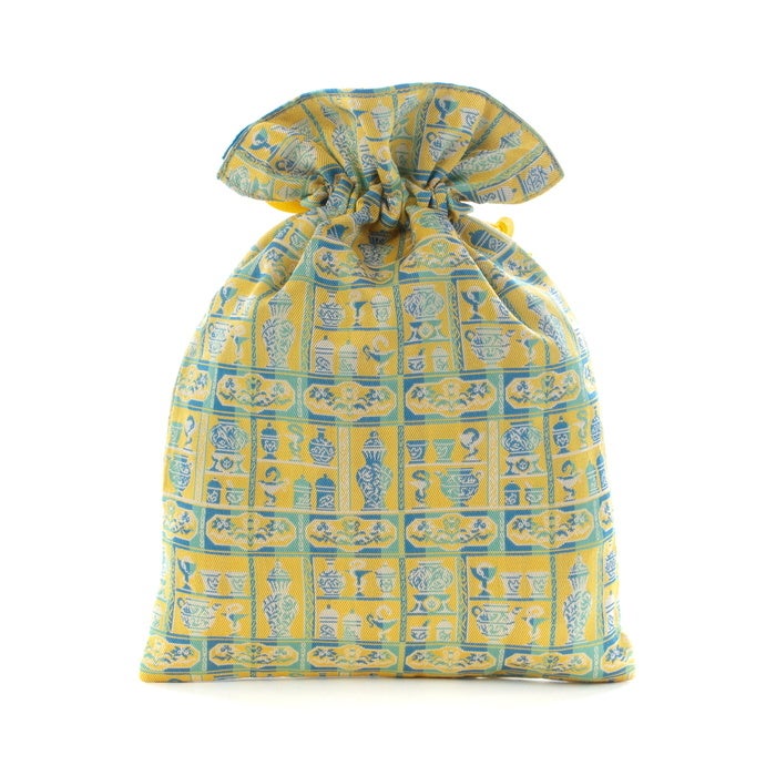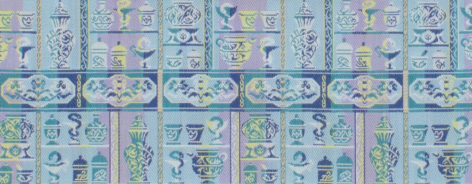 この経錦は東ヨーロッパの歴史ある薬局の薬棚に範を求め、薬学と縁深い蛇を組み合わせました。様々な陶器の薬壷が並ぶ美しい棚をノスタルジー溢れる趣そのままにデザインしたものです。長い歴史が今も息づき、ハーブが心地よく香る空間へ一歩足を踏み入れたときの高揚感を色鮮やかに表現しました。