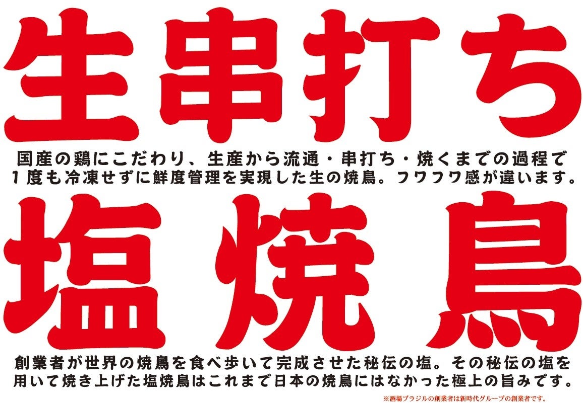 新時代グループ新ブランド『酒場ブラジル』創業6か月で東京進出決定。【生串打ち 塩焼鳥】が大ヒット中!!