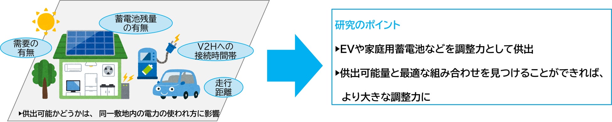 具体的には、「家庭が所有するリソースの種類」「敷地内の電力需要の有無」「EVが敷地に戻ってきているか」「EVの走行距離」「EVがV2Hに接続している時間帯」等、敷地内における電力ユーザーの生活パターン等から見出した電気の使われ方の法則と複数の要素を掛け合わせ、供出量と市場取引の際の収益性の両方が高くなる低圧リソースの組み合わせを調査・研究します。