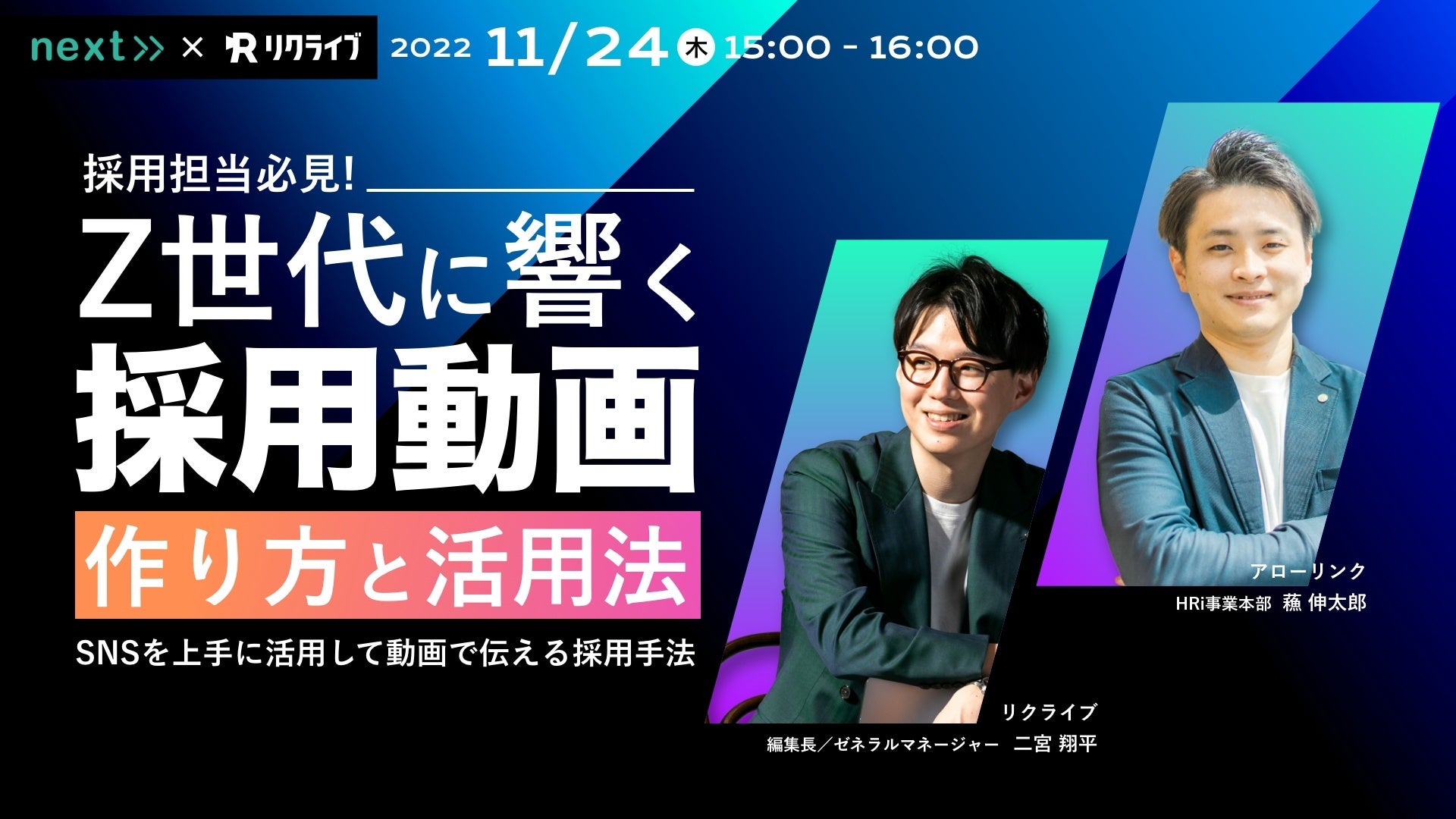 株式会社アローリンク(本社:兵庫県神戸市中央区、代表取締役:蓬莱和真)と、株式会社NKインターナショナル(本社:北海道札幌市、代表者:木田直樹)は、11/24(木)に無料オンラインセミナーを開催いたします。「Z世代に響く採用動画の作り方と活用」と題し、Z世代に対する採用ノウハウや動画作成と活用方法などをお伝えします。