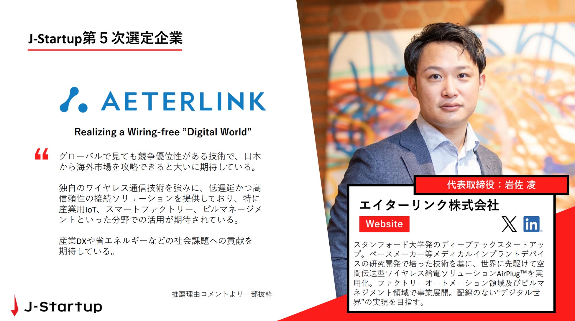 エイターリンク株式会社(本社:東京都墨田区、代表取締役:岩佐 凌、以下「エイターリンク」)は、経済産業省が運営するスタートアップ支援プログラム「J-Startup」の第5次選定企業に選出されたことをお知らせします。
